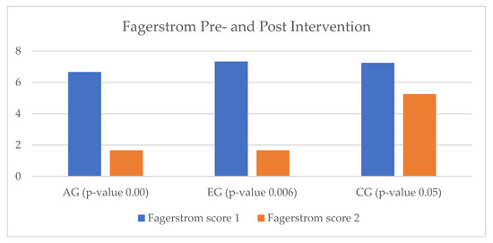 All smoking patients in the heart failure study group were assessed by means of the Fagerstrom questionnaire at the beginning of the cardiac rehabilitation program. In the EG, we enrolled three smokers, out of which only one was considered a regular smoker. Through the intervention of the virtual assistant, the patients in the EG presented a 50% reduction in nicotine use. In the AG, the decline in tobacco use was similar in terms of impact. In the CG, all four patients who were identified as smokers continued to smoke, but they also showed reductions in the number of cigarettes consumed per day (Figure 6).
