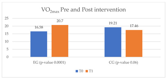 VO2max pre- and post-intervention. VO2max = maximal oxygen consumption by the body (measured in mL/kg/min); EG = experimental group; CG = control group; T0 = before the rehabilitation period; T1 = after the rehabilitation period.