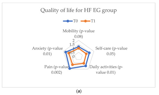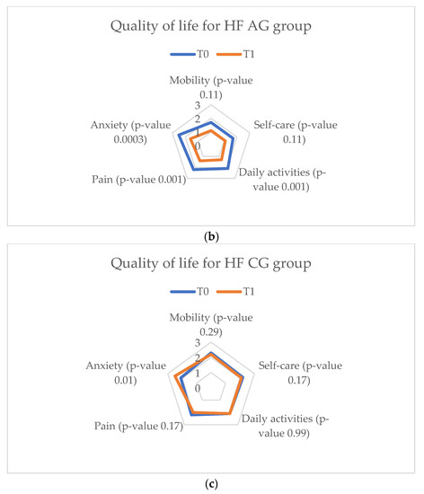 EuroQol-5D assesses five parameters considered as defining factors for a high quality of life (mobility, pain, anxiety, self-care, and daily activities). Between T0 and T1 a considerable improvement was evaluated in the EG and AG of the HF study groups, with superior results in the latter. In the CG, the quality of life did not undergo significant changes, with the parameters undergoing statistically insignificant changes (Figure 11).