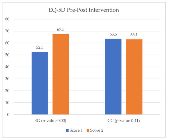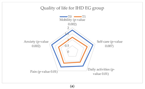 Regarding the application of the EQ-VAS questionnaire to the IHD study groups, the results were consistent with those of the EuroQol-5D. Consequently, patients from the EG showed a 15% increase in quality of life between T0 and T1, while in the CG there were no changes observed (Figure 14).