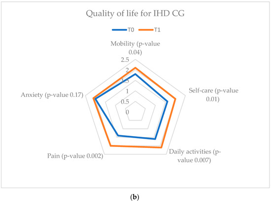The patients enrolled in the EG of the IHD study groups were assessed with an increase in quality of life at the end of the cardiac rehabilitation program via the vCare app, while the quality of life of the CG patients remained the same between T0 and T1 (Figure 13).