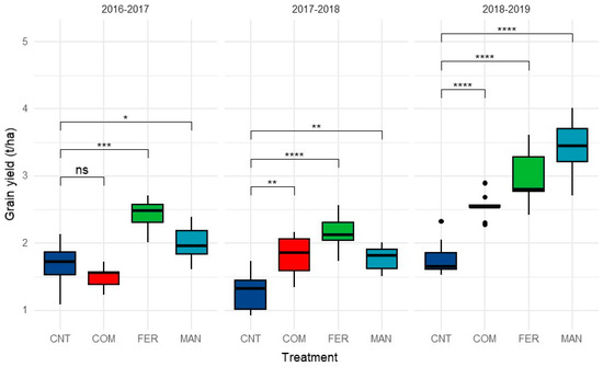 Box plots grain yield of barley grown under different N-source type fertilization schemes for three consecutive growing seasons. In the boxes, median values are indicated. Asterix’s denotes statistically significant differences between the means using Bonferroni adjusted t-test (* p < 0.05, ** p < 0.01, *** p < 0.001, **** p < 0.0001, ns: no significance).