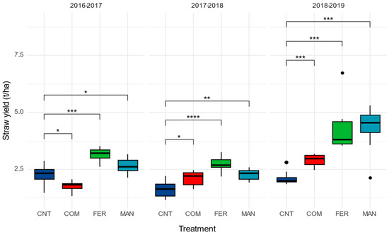 Box plots straw yield of barley grown under different N-source type fertilization schemes for three consecutive growing seasons. Solid lines in the boxes indicate median values. Asterix’s denotes statistically significant differences between the means using Bonferroni adjusted t-test (* p < 0.05, ** p < 0.01, *** p < 0.001, **** p < 0.0001).