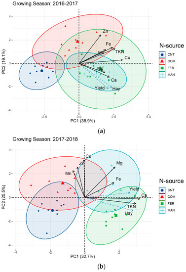 The barley grain mineral composition greatly influences its nutritional quality and it is important for human and animal nutrition. This study showed that N-source type affected the accumulation of the different macro- and micronutrients; however, this was dependent on the growing season. The uptake of macro- and micronutrients is affected by the interactions between the different available nutrients in the soil, and the nutrients externally applied. In addition, the differences in the nutrient management practices are affecting soil functioning and plant metabolism, while they are also shaping the microbial community structure, which in turn affects nutritional quality and plant composition [41]. Previous studies showed that micronutrient content increases after fertilization [42]. For example, nitrogen and phosphorus management has been identified as significant components controlling Zn concentration in cereals. The application of optimum N rates increases the Zn accumulation in wheat grain [43]. In the current study, the micronutrient content in barley grain was highly and significantly associated with N-source (Figure 4) and particularly with the application of organic amendments. For example, the repeated application of compost resulted in increased Zn concentration in barley grain over time, suggesting a more efficient utilization of this micronutrient from the soil. Similarly, Aghili et al. [44] showed that the incorporation of green manure caused a substantial increase in grain Zn concentration in bread wheat. The higher concentration of Zn found in the compost-treated plots could also be related to an increase in the bioavailability of this micronutrient. It is well established that the addition of organic amendments increases the amount of soil-organic carbon, which is significantly correlated with the increase in soil Zn availability [45]. The mechanisms responsible for the increase in Zn availability are not yet known, however, and further research is required.