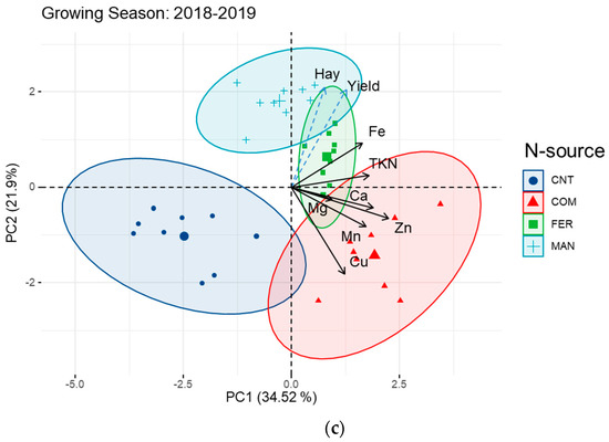 Principal component analysis and biplots of macro- and micronutrient content of barley grains grown under different N-source in three consecutive growing seasons (a) 2016–2017, (b) 2017–2018 and (c) 2019–2020. Solid black lines indicate active variables (macro- and micronutrient content) while dashed light blue lines refer to the dependent variables of straw and grain yield.