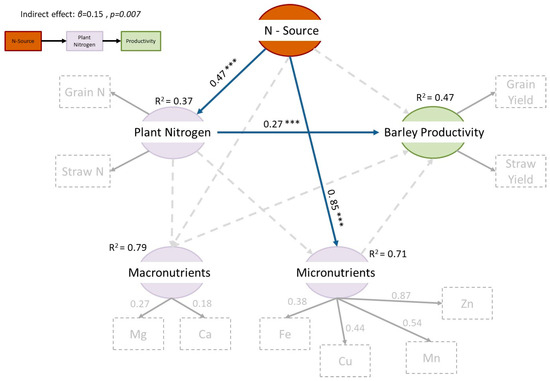 Structural equational modeling analysis results regarding the direct and indirect effects of N-source type on barley productivity, macro- and micronutrient content. Explained variance of the latent variables is presented next to each variable. Numbers next to path arrows are the standardized coefficients to account the effect sizes for significant associations (p < 0.05). Faint and dashed path arrows are not significant while blue path arrows denote statistically significant associations. Model fit was estimated using χ2, p-value (<0.05), comparative fit index (CFI > 0.9), root mean square error of approximation (0.06 ≤ RMSEA ≤ 0.08), standardized root-mean-square of the residuals (SRMR ≤ 0.08), and Akaike information criteria (AIC). Full results of the model analysis are presented in the Supplementary data section. *** p < 0.001.