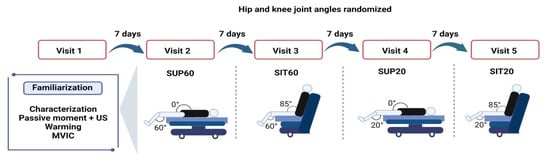 The protocol consisted of five laboratory visits (Figure 1), including a familiarization visit and four experimental visits. Each visit lasted 2–3 h and was performed seven days after the previous visit. We instructed participants to abstain from alcohol and stimulants (e.g., caffeine, chocolate, and performance supplements) for at least 24 h before visits, avert hard exercise 36 h ahead of the visits, and keep their common diet. We obtained anthropometrics (body mass and height) during the familiarization visit, and participants practiced ramped MVICs in each position. The positions were tried apart in each experimental session and composed of 12 MVICs to complete all ultrasound imaging and electromyography exams (two for EMG, two for patellar tendon properties, and eight for muscle architecture).