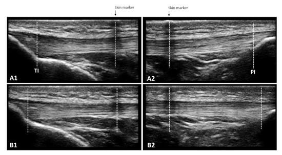 The same ultrasound system, settings, and synchronization method used for muscle architecture were also used for the assessment of the patellar tendon properties. The resting length was obtained with the ultrasound probe positioned longitudinally along the tendon, from the patella’s apex to the deep insertion to the tibial tuberosity []. If the size of the transducer did not allow the complete visualization of the patellar tendon, then it was obtained using an overlapping images method adopted by [] (Figure 3). The length from the marker to each anatomical structure was measured with Tracker 4.87 software (www.physlets.org/tracker/ (accessed on 13 December 2018)) and summed to determine the patellar tendon length, according to [].
