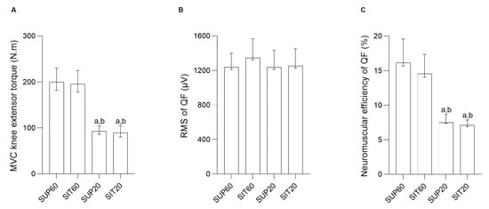 MVIC knee extensor torque, Root Mean Square and neuromuscular efficiency of the quadriceps femoris constituents according to hip and knee angles during contraction. (A) MVIC knee extensor torque (N.m) (left y-axis) and different conditions (right x-axis). (B) Root Mean Square of quadriceps femoris (µV) (left y-axis) and different conditions (right x-axis). (C) Neuromuscular efficiency of the quadriceps femoris (%) (left y-axis) and different conditions (right x-axis). Data are presented as geometric means and confidence intervals (CI 95%). Legend: MVIC: Maximal Voluntary Isometric Contraction; RMS: Root Mean Square; QF: Quadriceps femoris; SUP60: supine with 60° of knee flexion; SIT60: seated with 60° of knee flexion; SUP20: supine with 20° of knee flexion; SIT20: seated with 20° of knee flexion. Significant differences: a different from SUP60 at (p ≤ 0.05). b different from SIT60 at (p ≤ 0.05).