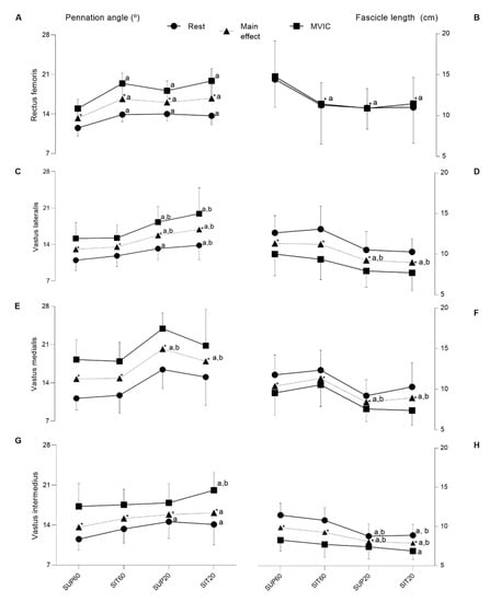 The pennation angle and fascicle length of the quadriceps femoris constituents according to hip and knee angles during rest and contraction. Muscle (left y-axis) and different conditions (right x-axis). Rest (closed circle line), main effect (closed triangle line) and during MVIC (closed square line). The first column (pennation angle—θp (°) and second column (fascicle length—Lf (cm)). Data are presented as means and confidence intervals (CI 95%). (A,B) Rectus femoris; (C,D) Vastus lateralis; (E,F) Vastus medialis; (G,H) Vastus intermedius. Legend: SUP60: supine with 60° of knee flexion; SIT60: seated with 60° of knee flexion; SUP20: supine with 20° of knee flexion; SIT20: seated with 20° of knee flexion; θp: pennation angle; Lf: fascicle length. Significant differences: a different from SUP60 at (p ≤ 0.05); b different from SIT60 (p ≤ 0.05); * indicate significant differences in intensity (p ≤ 0.05) between rest and MVIC.