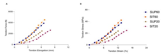 Stiffness presented higher values at SIT60 in comparison with SUP20 and SIT20 positions. It is probably due to higher levels of force being applied to the tendon and, consequently, the higher level of tendon stiffness presented. It is possible to notice that a longer position generates greater tendon stiffness, in agreement with Kubo et al. (2006) [] during an isometric training protocol. According to these results, it seems preferable to load the patellar tendon at voluntary contractions using the knee at 60°. Simultaneously, the hip angle variation may affect how tensile loads are transmitted through the tendon. The increase of stiffness in positions at 60° can provide an advantage in rehabilitation since it promotes more significant tension generation in the muscle-tendon unit. As tendon stiffness increases with high-intensity training [,], the high load achieved by muscle contractions in this angle can lead to higher tendon adaptations than training programs with lower loads. A remarkable finding was that patellar tendon stress supports the force results (i.e., significant stress with the knee at 60° without the hip’s influence). Therefore, we cannot attribute these results to differences in the CSA average, but rather to the different higher strength levels in positions at 60° of knee flexion. Stress and Young’s modulus were greater with the knee flexed at 60° compared to 20°.