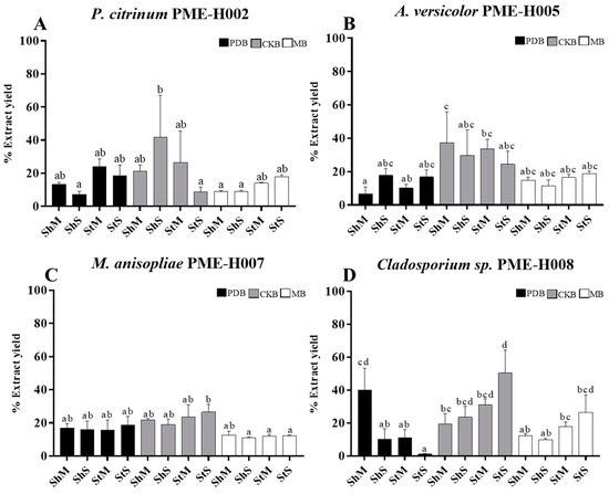 Yield of methanol extracts from endophytic fungal strains under different culture conditions. (A) P. citrinum PME-H002. (B). A. versicolor PME-H005. (C) M. anisopliae PME-H007. (D) Cladosporium sp. PME-H008. Data represent the mean ± SD of three replicate determinations from three independent experiments. Different letters indicate significant differences (p < 0.01), using the one-way ANOVA. Sh, shaking; St, static; M, mycelium; and S, spore.