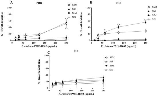 Percentage growth inhibition of P. citrinum PME-H002 strain methanol extracts against L5178Y-R cells in different media and culture conditions. (A) PDB, (B) CKB, and (C) MB. Data represent the mean ± SD of three replicate determinations from three independent experiments. * p < 0.05, ** p < 0.01, as compared with the untreated control using the Kruskal–Wallis test. Sh, shaking; St, static; M, mycelium; S, spore.