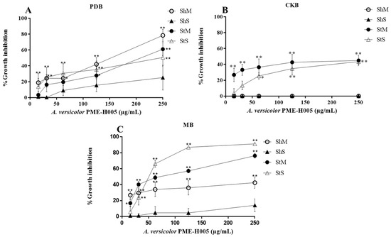 Percentage growth inhibition of A. versicolor PME-H005 strain methanol extracts against L5178Y-R cells in different media and culture conditions. (A) PDB, (B) CKB, and (C) MB. Data represent the mean ± SD of three replicate determinations from three independent experiments. * p < 0.05, ** p < 0.01, as compared with the untreated control, using the Kruskal–Wallis test. Sh, shaking; St, static; M, mycelium; S, spore.