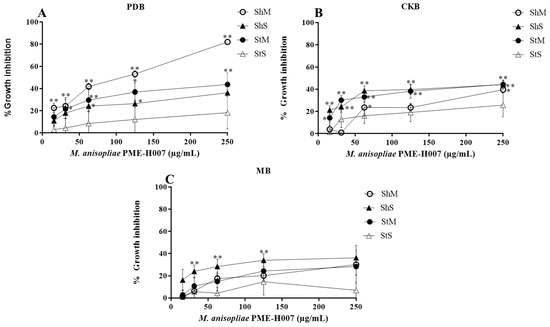 Percentage growth inhibition of M. anisopliae PME-H007 strain methanol extracts against L5178Y-R cells in different media and culture conditions. (A) PDB, (B) CKB, and (C) MB. Data represent the mean ± SD of three replicate determinations from three independent experiments. * p < 0.05, ** p < 0.01, as compared with the untreated control, using the Kruskal–Wallis test. Sh, shaking; St, static; M, mycelium; S, spore.