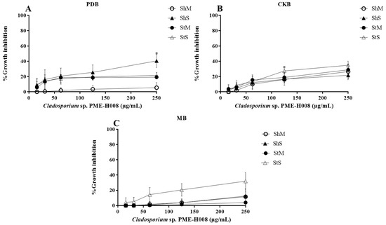 Percentage growth inhibition of Cladosporium sp. PME-H008 strain methanol extracts against L5178Y-R cells in different media and culture conditions. (A) PDB, (B) CKB, and (C) MB. Data represent the mean ± SD of three replicate determinations from three independent experiments. * p < 0.05, ** p < 0.01, as compared with the untreated control, using the Kruskal–Wallis test. Sh, shaking; St, static; M, mycelium; S, spore.