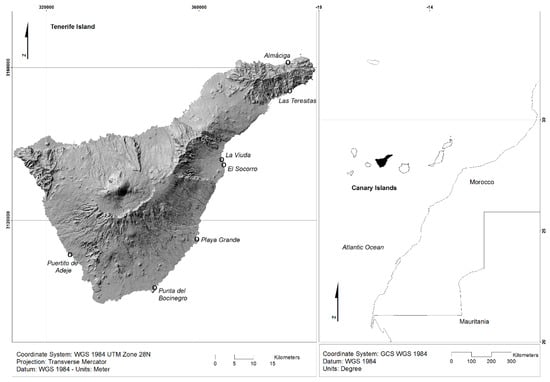 The study area included seven different beaches of the island of Tenerife, in the Canary Islands, Spain: Almáciga, Las Teresitas, La Viuda, El Socorro, Playa Grande, Punta del Bocinegro and Puertito de Adeje (see Figure 1 and Table 1 for sampling points and sampling locations characteristics). All 7 beaches are frequented by bathers and/or sportspeople all year round.
