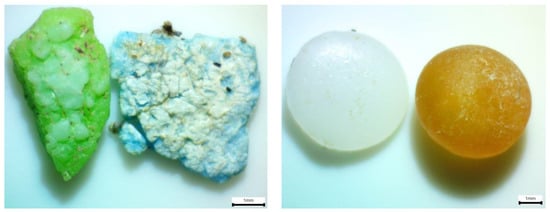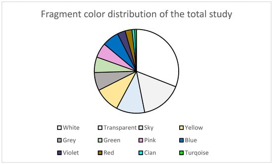 The ageing/weathering process, mainly by photodegradation, is the major cause of fragment whitening and pellet yellowing [,,]. In the study of Rodriguez et al., 2019, 90.6% of the pellets were translucent, probably due the nearby dumping of its particles []. The results of this study showed that most fragments present light hues, indicating that they probably have been in the marine environment for a long time.