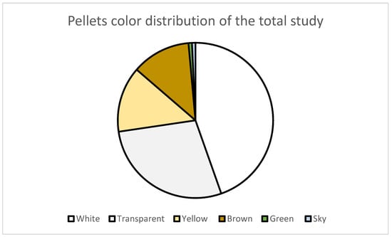 Regarding the pellets colors distribution (Figure 3) (n = 139), predominant colors were white (44.6%), transparent (28.1%), yellow (13.7%), brown (12.2%), green (0.7%) and sky blue (0.7%). The pellets’ hues were 98.6% light and 1.4% medium. It should be emphasized that the percentages of yellow and brown add up to 25.9%. The pellets found belong to the light hues most probably since their original color comes from white or transparent but has endured a weathering process in the marine environment towards more yellow or brown hues.