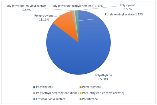 As to MPs composition, a total of 171 samples (16.6%) were analyzed. The most abundant polymers were polyethylene (85.4%) and polypropylene (11.1%). In the study by Frère, et al., 2018, in the Bay of Brest, MPs made of polyethylene, polypropylene and polystyrene were found [], similarly to Viršek et al., 2019, in the Adriatic Sea, who signal polyethylene (75%) and polypropylene (9.3%) as main components of MPs [].