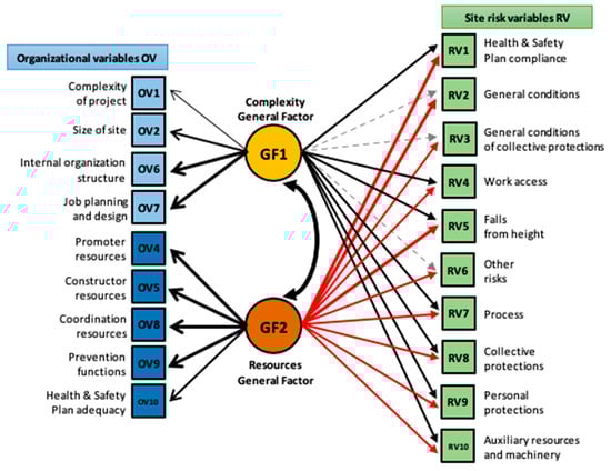 25] have proposed an alternative specification of the relational model connecting risk on-site and organizational factors. Based on empirical data, their idea is to identify and clarify the most significant relational paths connecting specific RVs with organizational factors as precursors. This approach decomposed the RSI into its ten RVs and hypothesized the OVs into two broader latent factors representing organizational Complexity (F1) and organizational Resources (F2) using structural equation modeling techniques.
