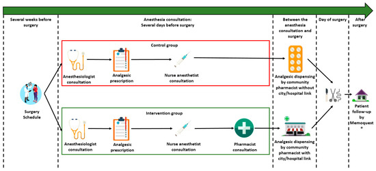 As presented in Figure 1, the pharmacist consultation was scheduled during the anesthesia consultation. Consecutively, in the intervention group, the patient had, first, a 15 min consultation with the anesthetist, then, a 15 min consultation with the nurse anesthetist, and finally, a 15 min consultation with the pharmacist, specifically on analgesic treatment based on the prescription written by the anesthesiologist. After the interview with the patient, the hospital pharmacist immediately contacted the patient’s community pharmacist to report the interview. Thus, all post-operative management was entrusted to the patient’s community pharmacist closer to the patient.