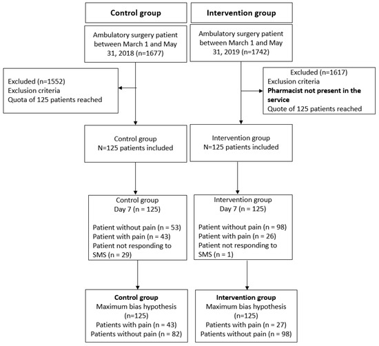 The inclusion criteria were outpatients aged >18 years, who had general or locoregional anesthesia for orthopedic (ORT), odontologic, maxillofacial and ear, nose, and throat (MF/ENT), digestive and visceral, gynecologic, ophthalmologic, plastic and vascular ambulatory surgeries. In the intervention group, outpatients had to have a pharmacist intervention to be included. Exclusion criteria were outpatients who had an ASA (American Society of Anesthesiologists) score ≥3, chronic pain or long-term analgesic treatment, a psychiatric disorder and advanced cognitive impairment, pregnancy, a contraindication to ambulatory surgery, lack of French language proficiency, conversion to conventional hospitalization, a surgical or anesthesia-related complication. Outpatients operated on by surgeons who practiced in 2018 but not in 2019 were not included. Finally, in accordance with the regulations, the outpatients placed under legal protection, guardianship, or curatorship were excluded.