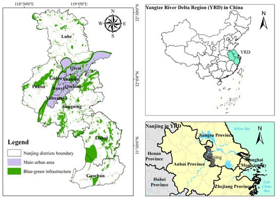 Nanjing, located at 118°22′ E~119°14′ E, 31°14′ N~32°37′ N, is the capital of Jiangsu Province and the political, economic, and cultural center (Figure 1). Nanjing is an important central city in the Yangtze River Delta region and an imperative node city at the intersection of the Yangtze River Economic Belt and the Coastal Economic Belt. The climate is classified as the north subtropical monsoon climate, with an average annual precipitation of 1090.4 mm, an average annual temperature of 13~22 °C, and prevailing northeast and southeast winds. Nanjing positions north–south long, east–west narrow. In the territory of Nanjing, the terrain contains hillock, plain, low-lying ground, marshes, low mountains, and hills as a geomorphic complex. By 2020, the city had a total area of 6587 km2, including 868.28 km2 of built-up area. It has jurisdiction over 11 municipal districts and one state-level new district (Jiangbei New Area), with a permanent population of 9,319,700 and an urbanization rate of 86.8%.
