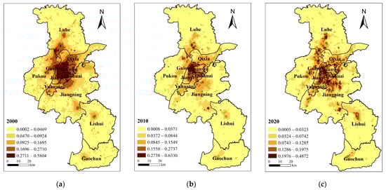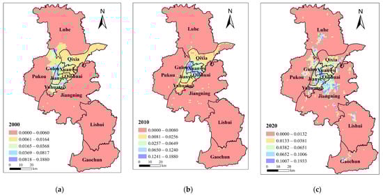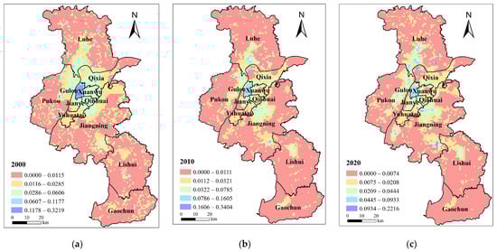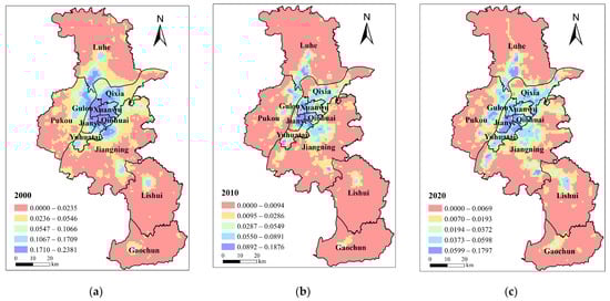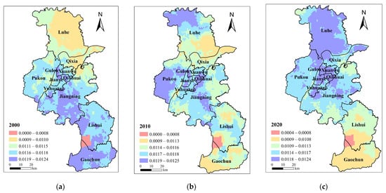 Economic demand distribution pattern of blue–green infrastructure in Nanjing in (a) 2000; (b) 2010; (c) 2020.