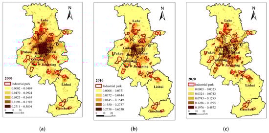 Layout characteristics of industrial parks and blue–green infrastructure demand in Nanjing in (a) 2000; (b) 2010; (c) 2020.
