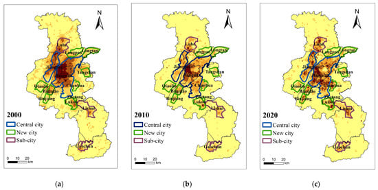Urban spatial pattern and blue–green infrastructure demand of Nanjing in (a) 2000; (b) 2010; (c) 2020.
