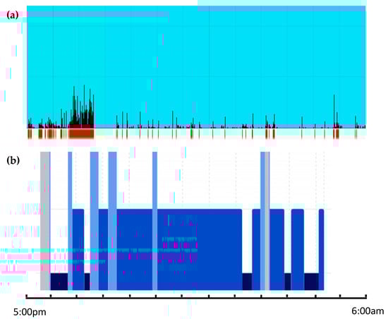 Sleep activity for one participant. (a) Philips Actiwatch: Blue shaded region represents time asleep; black bar graph indicates movement and activity overnight; and red lines indicate awake periods. (b) WSA: Blue and black regions represent sleep and deep sleep periods respectively; grey regions represent awake periods.