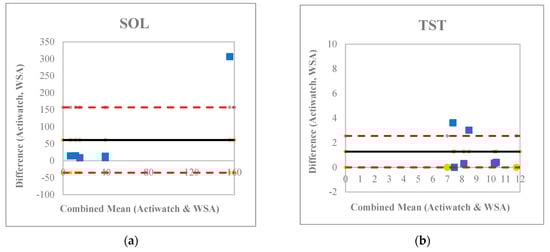 SPSS (version 28.0, IBM, IL, USA) was used to test the level of agreement, within participants, between the Actiwatch and WSA for SOL, TST, number of awakenings, WASO, and SE via intraclass correlation coefficients (ICC) [18]. Absolute agreement with a two-way mixed effect model was used to determine average ICC. This approach was selected, as we assumed that the error from the devices would be predictable and fixed, and the error from the participants would be random. Agreement between the Actiwatch and participant-reported SOL, TST, and number of awakenings were also examined. ICC categories were established a priori to be poor (<0.50), moderate (0.50–0.75), good (0.75–0.90), and excellent (>0.90) [20]. Bland–Altman plots were generated to display the differences between the Actiwatch and WSA devices against the overall mean scores for the two devices, including the upper and lower 95% limits around the combined mean, consistent with previous studies examining the validity of sleep recording devices [14,18,21].