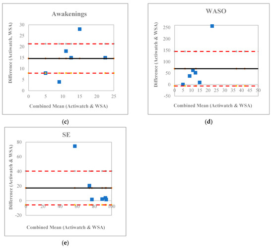 The Bland–Altman plots demonstrated a broad range in the difference between Actiwatch and WSA device data (Figure 2). Participants whose data fell outside of the 95% confidence interval around the combined mean between the Actiwatch and WSA typically had longer sleep onset latency, lower total sleep time, more awakenings, and lower sleep efficiency, highlighting that there was a potential bias towards poor agreement when people had worse sleep.