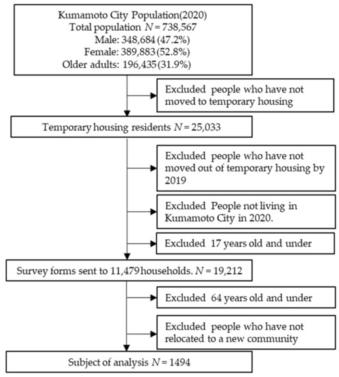 - Ito, K.; Tomata, Y.; Kogure, M.; Sugawara, Y.; Watanabe, T.; Asaka, T.; Tsuji, I. Housing type after the Great East Japan Earthquake and loss of motor function in elderly victims: A prospective observational study. BMJ Open 2016, 6, e012760. [Google Scholar] [CrossRef]