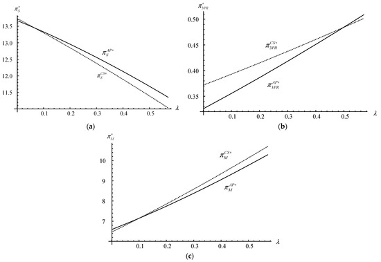 The disassembly rate has different promotion effects on the manufacturer and on the 3PR under different platform participation strategies. For the manufacturer, when the disassembly rate is not sufficiently small, the manufacturer selects strategy CS and increasingly prefers a higher disassembly rate (i.e., when λ > 0.1, and ). While for the 3PR, only when the disassembly rate is not very high does the 3PR prefer strategy CS (i.e., when λ > 0.5, ). This means that the dismantling rate is a boost for both the manufacturer and 3PR, but under the premise of a certain dismantling rate, strategy AP is more beneficial to the 3PR, while strategy CS is more beneficial to the manufacturer; they are both better off in situations where the opposite side bears more of the cost.