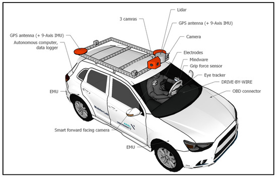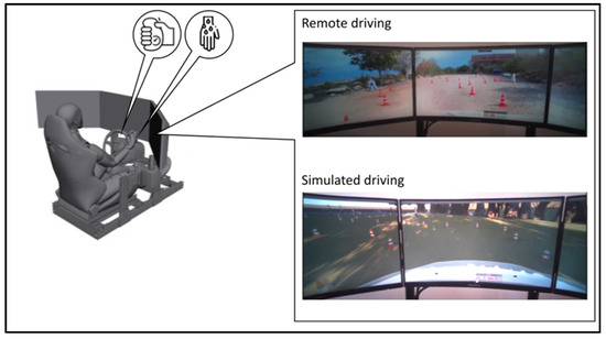 Two modes of operation were applied in the current experiment, as illustrated in Figure 1. One was the control of an instrumented Kia Nero (hereafter, the ‘Mobile-Lab’, see Figure 2) from a distance (hereafter, ‘Remote driving’), and the other was the operation of a virtual car in a simulated driving environment (hereafter, ‘Simulated driving’). The operation station (for both remote driving and simulated driving) was located in a laboratory room. It consisted of a SPEEDSeat SS-V1 gaming seat, three G27FC gaming monitors, a Logitech G29 gaming steering wheel and pedals, and a PC with an Intel® Core™ i7-10700K processor and GeForce RTX 3080 graphics card. The simulation environment was supplied by Cognata Studio.