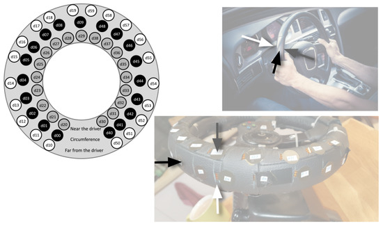 The steering wheel was embedded with 60 FSR sensors, which were grouped on three surfaces: close to the driver (grey circles in the illustration), on the circumference (black circles in the illustration), and on the surface far from the driver (white circles in the illustration).