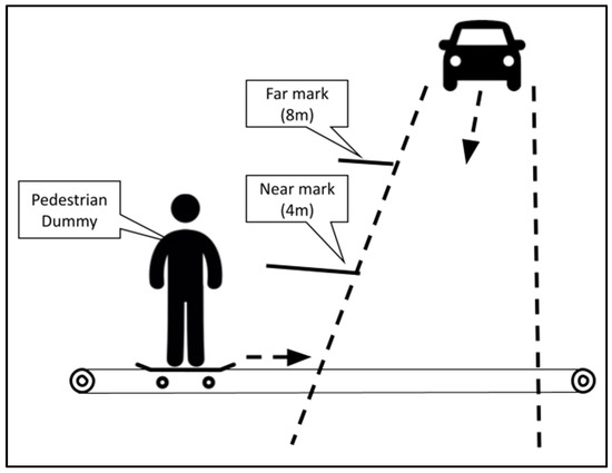 Pedestrian dummy crossing manipulation, consisting of a pedestrian dummy (fixed on a skateboard moved by cables) being moved into the driving route at one of two distances in front of the vehicle: 4 m (close) or 8 m (far).