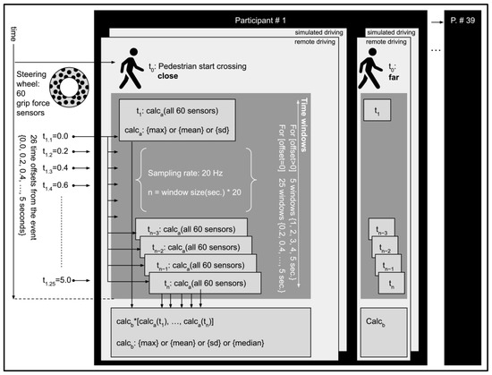To explore diverse means of quantifying the raw grip force measurements, multiple parameters were applied, as illustrated in the infographics in Figure 6. The parameters were the time window, offset from the crossing event, the surface of the steering wheel, and the combination of calculations (for each sample and for all samples in the entire time window).