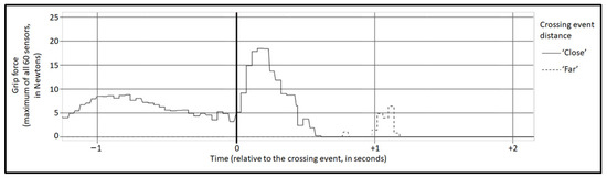 Raw grip force data from two crossing events of a single participant (randomly selected). X-axis represents time in relation to the crossing event (minus = before the event). Y-axis represents the maximal grip force at each measurement instance for all 60 sensors. The continuous line represents a ‘Close’ crossing event, while the dashed line represents a ‘Far’ crossing event.