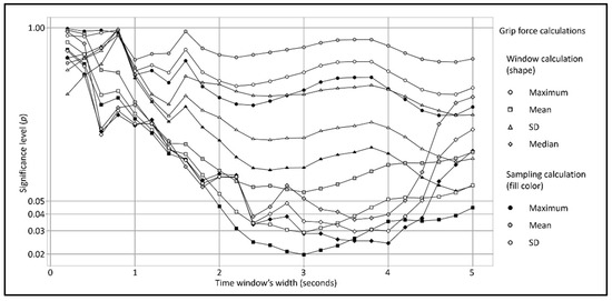 Significance level (p) of LMM analyses of grip force as a function of the crossing distance with the participant as the random effect, various time window widths, and no offset from the crossing event. X-axis expresses the width (0.2 to 5 s, 0.2 s increments), and Y-axis expresses the significance level (p), logarithmically scaled for representation. The shape type represents the window calculation (circle = maximum, square = mean, triangle = SD, rhombus = median), and the fill color represents the sampling calculation (black = maximum, grey = mean, white = SD).