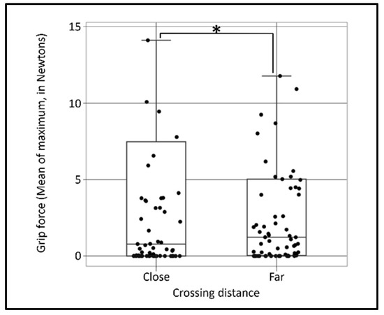 Grip force (window calculation: mean, single measurement event calculation for all 60 sensors; maximum in Newtons) as a function of the crossing distance. Boxes represent the inter-quartile range (IQR = Q1 to Q3) of the group, middle horizontal line represents the group’s median, upper line represents the largest value that is less than the upper quartile plus 1.5 times IQR, and lower line represents the smallest value that is greater than the lower quartile minus 1.5 times IQR. Asterisk (*) denotes a level of significance of p < 0.05.