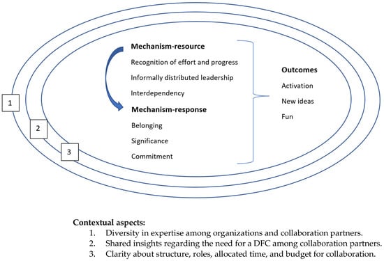 Although the importance of insight into the collaboration and facilitating and hindering factors is often mentioned, the literature does not explain how collaboration for DFIs works, i.e., which mechanisms are important and which outcomes represent a successful collaboration for DFIs. In our previous study of the Mentality project, we made a first attempt at explaining such causal relationships in an initial theory of collaboration during the development and sustainment of DFIs, based on an analysis of four Dutch best practices of DFCs []. Our initial theory about collaboration highlights how contextual aspects such as a personal connection with dementia, the diversity among stakeholders, and the transparency about budget and manpower, as well as mechanisms such as a personalized role, sharing information and joint decision-making lead to feelings of control, connection and being part of a network, evolving into outcomes of collaboration such as taking initiative and/or continuing commitment to a DFIs, satisfaction, purposefulness, and enjoyment in collaboration []. Insights on the involvement of people with dementia and their carers were limited in the initial theory of collaboration [].