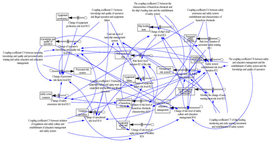 Considering the above, it is of great research value to conduct risk coupling analysis focused on ports, as they are important distribution centers of hazardous chemicals, as well as adopting system dynamics to simulate logistics safety accidents. Therefore, aiming at the multi-factor coupling problem of port hazardous chemical logistics risk, we construct a multi-factor coupling measurement model, which is then combined with a computer simulation method based on system dynamics risk coupling measurements to simulate and analyze the above-mentioned risk coupling model, in order to reveal the complex dynamics of the process of port hazardous chemical logistics risk coupling, as well as to deeply explore the risk coupling of port hazardous chemical logistics, which has certain theoretical and practical significance.
