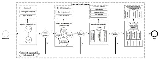 Chen, J.; Liu, Q.; Liu, X.; Wang, Y.; Nie, H.; Xie, X. Exploring the Functioning of Online Self-Organizations during Public Health Emergencies: Patterns and Mechanism. Int. J. Environ. Res. Public Health 2023, 20, 4012. https://doi.org/10.3390/ijerph20054012