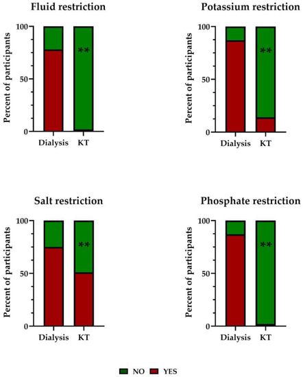Proportion of participants reporting restrictions in fluid, potassium, salt, or phosphate intake. ** p < 0.001 vs. the dialysis group. KT, kidney transplant.