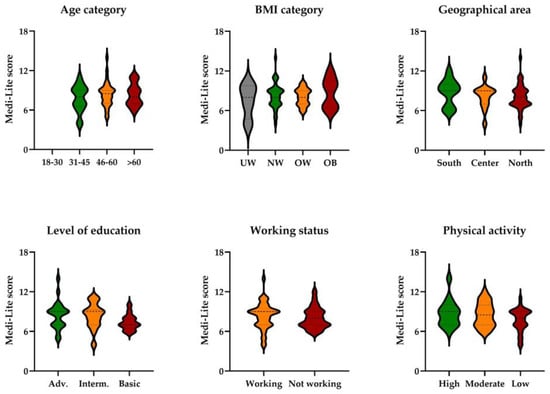 In participants on dialysis, the MEDI-LITE score did not differ among individuals of different sex (p = 0.590), age (p = 0.715), or BMI (p = 0.901) categories, from northern, central, or southern Italy (p = 0.408), by the level of education (p = 0.103), working status (p = 0.296), or level of physical activity (p = 0.266) (Figure 3).