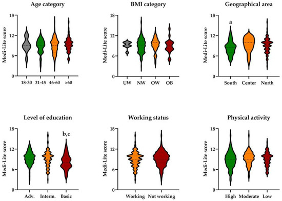 MEDI-LITE score by age category, body mass index (BMI) category, geographical area, level of education, working status and physical activity level in KT recipients. UW, underweight; NW, normal weigh; OW, overweight; OB, obesity; Adv, advanced; Interm., intermediate. a p = 0.031 vs. central Italy; b p = 0.016 vs. intermediate; c p = 0.006 vs. advanced level of education.