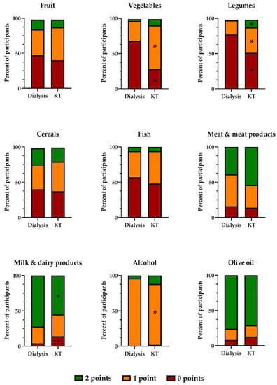 Proportion of participants reporting optimal (2 points), intermediate (1 point), or inadequate (0 points) intake of each food category included in the MEDI-LITE questionnaire. * p < 0.05 vs. the corresponding category in the dialysis group.